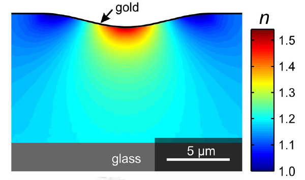 Во втором случае, когда пластина расположена под «ковром», никаких неоднородностей в распределении интенсивности отраженного света не наблюдается (рис. 2B). Происходит это благодаря анизотропии показателя преломления фотонного кристалла. Этот показатель меняется так (рис. 3), что по мере продвижения вглубь кристалла инфракрасные лучи всё сильнее отклоняются влево и вправо от своего первоначального направления. В итоге область, которая находится под выступом (в реальности — над выступом, поскольку изображение перевернуто) с наибольшим показателем преломления, становится недоступной для инфракрасного света. Лучи просто обходят эту область и тем самым не попадают на выступ. Далее отклоненные лучи отражаются от ровной поверхности золотой пластины и тем же образом идут назад, создавая в итоге иллюзию невидимости выступа. Таким образом, получается, что арка становится невидимой для излучения данного (инфракрасного) диапазона, а значит, плащ-невидимка прекрасно справляется со своей работой.