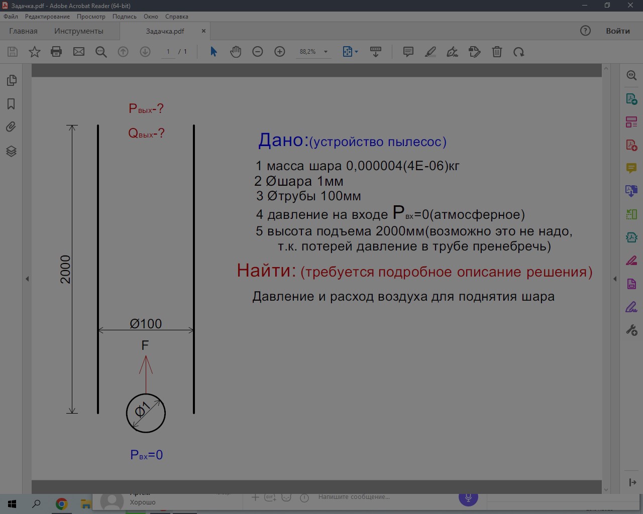 Требуется расчет давление и расход воздуха для поднятия шара. Данные приведены в файле