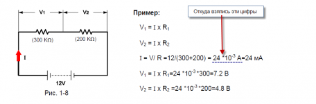 \(V_1=IR_1=24\cdot{10^{-6}}\cdot{3\cdot{10^5}}=7,2 B\)