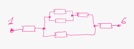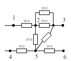 Дана простая электрическая цепь, необходимо на путях рассчитать R_эквивалентное пользуясь методом свёртывания, зная, что каждый резистор R=20 Ом.