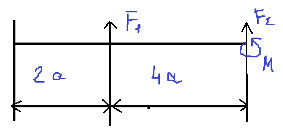 Для заданной стальной жестко защемленной балки определить реакции опор, построить эпюры поперечных сил и изгибающих моментов и определить из условия прочности требуемый размер круглого сечения балки, если F1 = 12 kH, F2 = 10 kH, M = 12 kHm, a = 1 m, ơ = 140 МПа.
