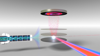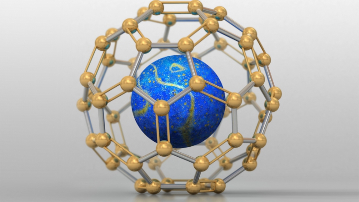 Шестьдесят атомов углерода образуют сферическую клетку, называемую фуллереном, которая может захватывать молекулу азота. Эта компоновка защищает азот (синий) от магнитных помех, позволяя ему резонировать и, таким образом, служит основой для атомных часов