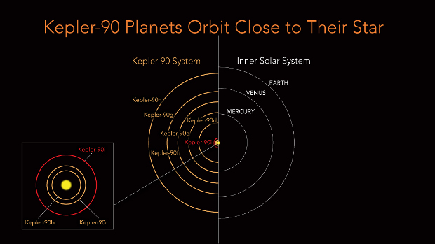 В результате им удалось пополнить систему Kepler-90 еще одной, восьмой планетой. Эта планетная система, если не считать количества планет, мало похожа на Солнечную. Все ее восемь планет находятся очень близко к своей звезде. Если бы планеты Kepler-90 оказались в Солнечной системе, они оказались бы внутри земной орбиты. Радиус восьмой планеты в 1,32 раза больше земного, а период обращения вокруг звезды составляет всего 14,4 дня — она расположена очень близко к звезде, и это делает ее совершенно непригодным для жизни, температура на ее поверхности превышает 420 градусов Цельсия.